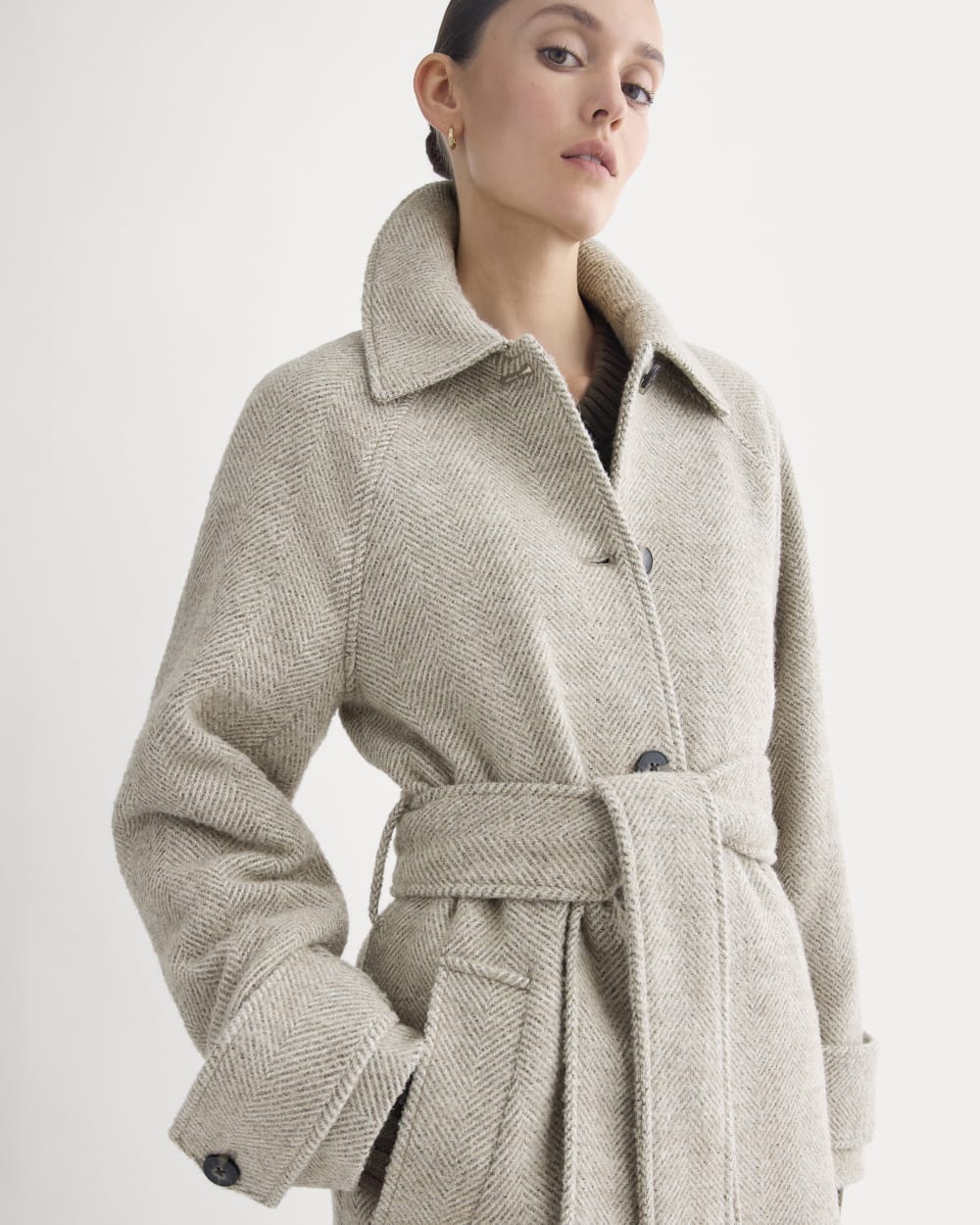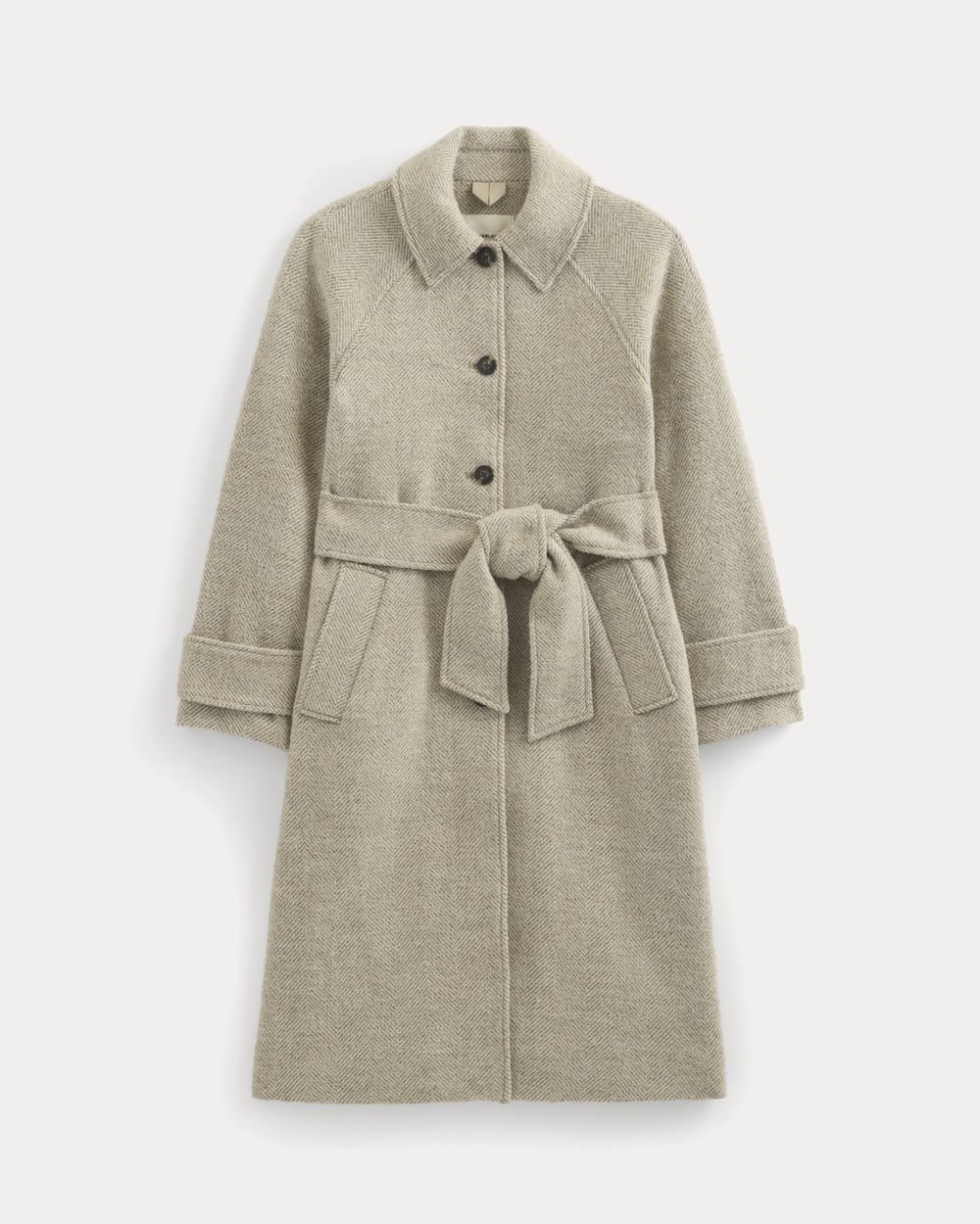 Because it’s just that exceptional. Featuring a button-front closure. front welt pockets. adjustable tabs on the sleeves. and a tie belt to cinch you in. Made with a recycled wool blend produced in Italy at Manifattura Emmetex. Herringbone design with textured boucle yarn finish and wooly handfeel. Heavyweight and hits below the knees??so you can show off your tall boots.