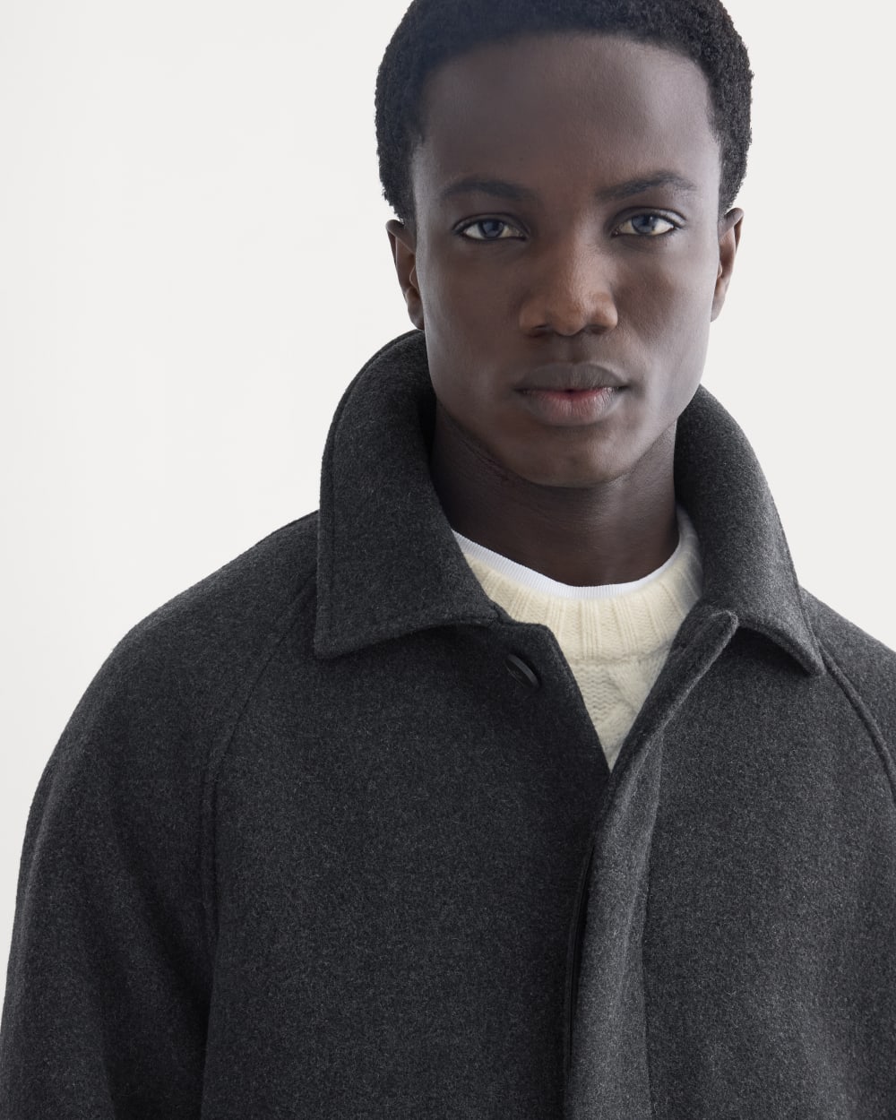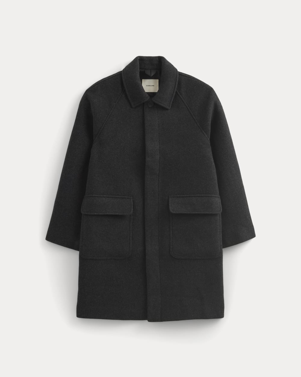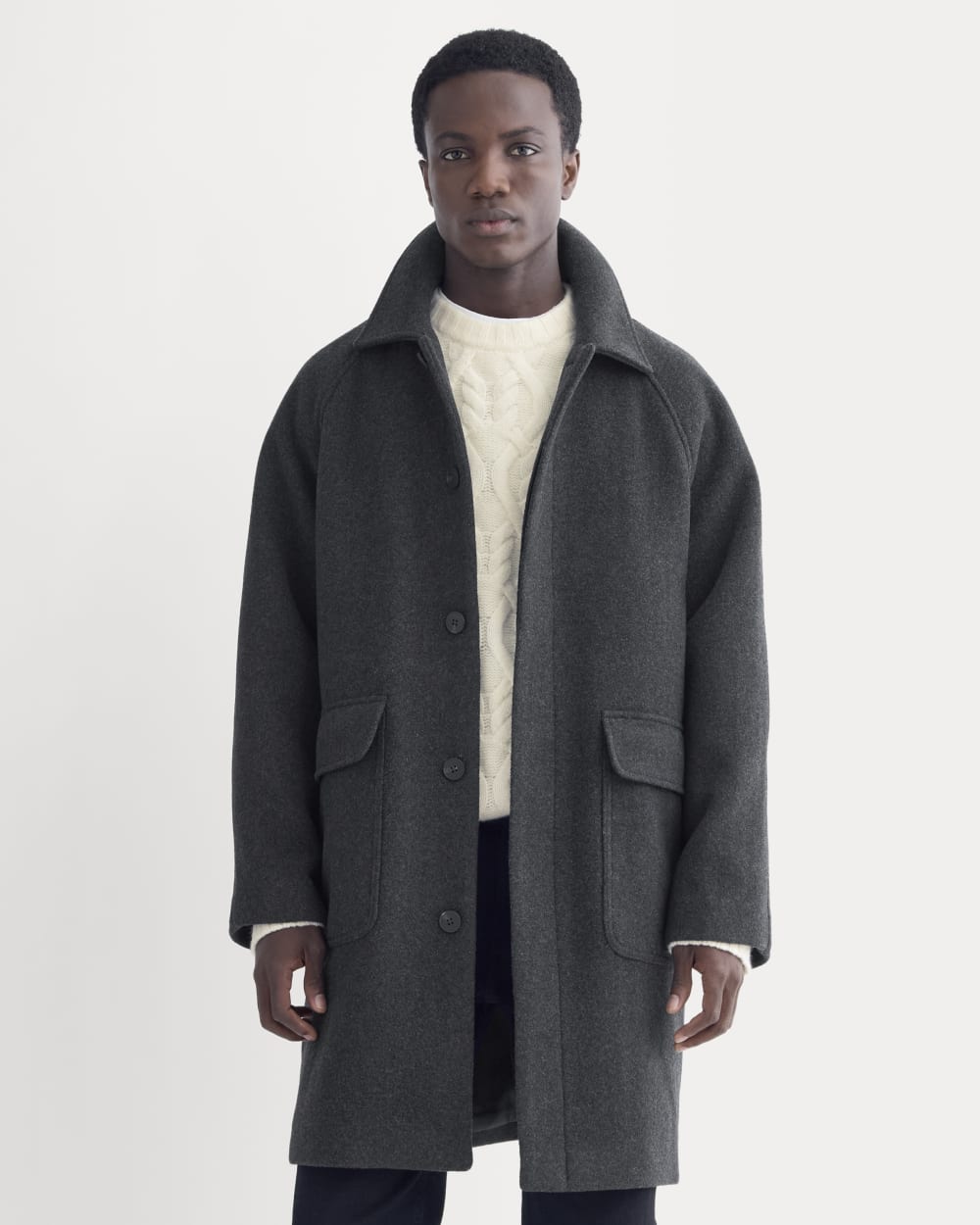 Think of this as the workhorse of your winter wardrobe. Heavy recycled wool-blend fabric for warmth. clean finishing for a modern edge. Hidden buttons. raglan sleeves. and smart pocketing make it as functional as it is good-looking. The kind of coat that makes even jeans and sneakers feel pulled together.