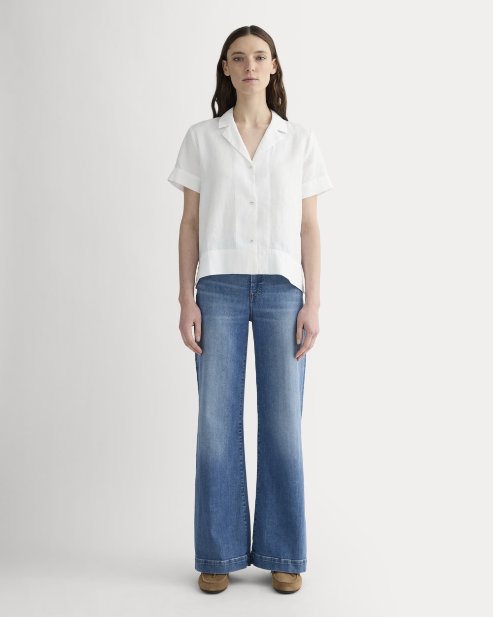 This piece features a relaxed fit. short sleeve. notch collar. and button closure. in linen.