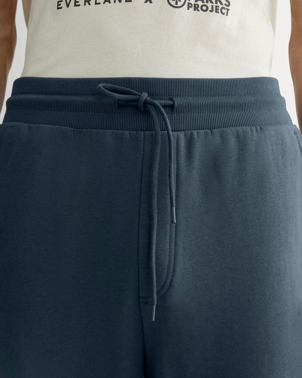 This piece features a classic jogger silhouette. elastic waistband with drawstrings. faux fly. slant pockets on side seams. back pocket. rib trim at waist and hems. in a lighter-weight French Terry OCS-certified organic cotton and recycled polyester blend for year-round wear.