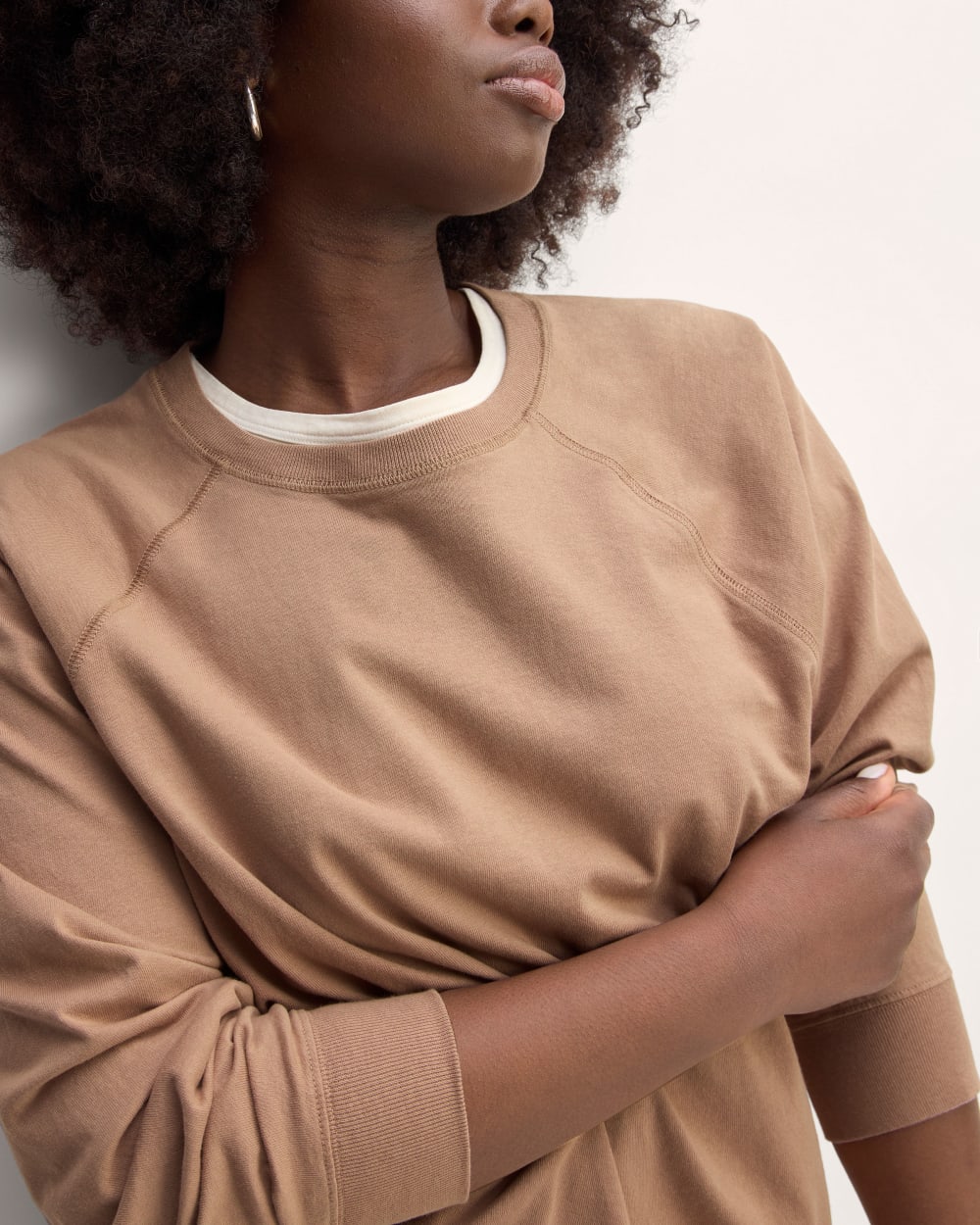 This piece features a relaxed fit. crew neckline. long. raglan sleeves. in premium weight 100% organic cotton jersey.