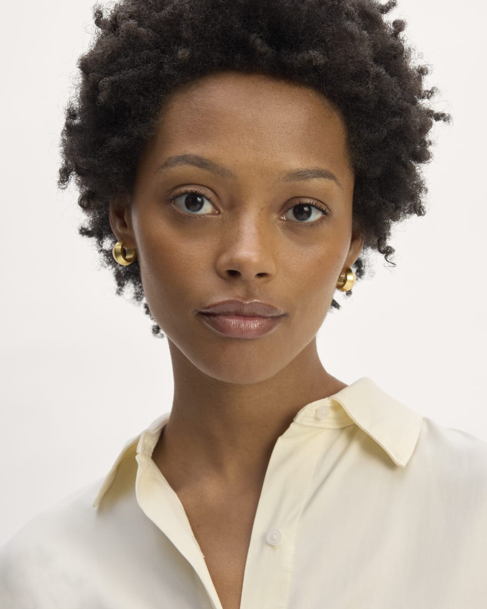 This piece features an oversized fit. shirt collar. front button closure and cuffs. long sleeves. and shirttail hem.