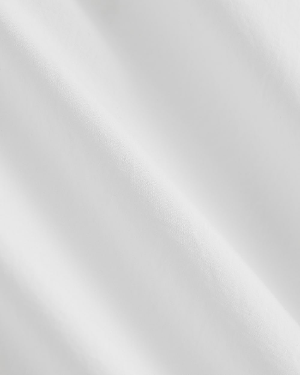 This piece features an oversized fit. long sleeves. band collar. button-front closure. and back yoke in 100% organic cotton.
